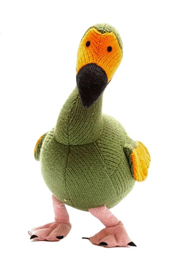 This knitted, cuddly Dodo is adorable and would make an excellent present for a small human person in your life. How dashing it would look with a velvet bow tied rakishly at its neck!