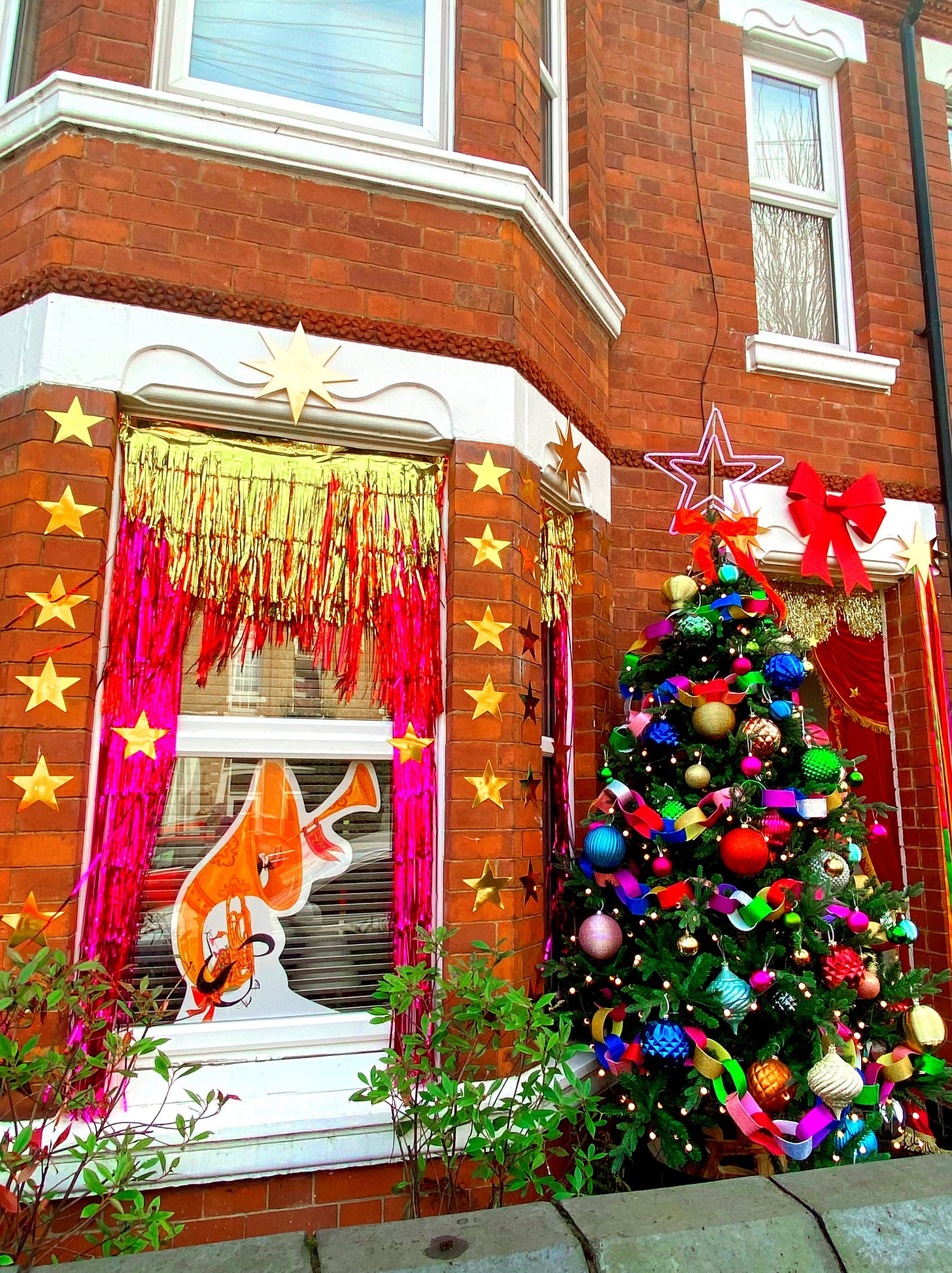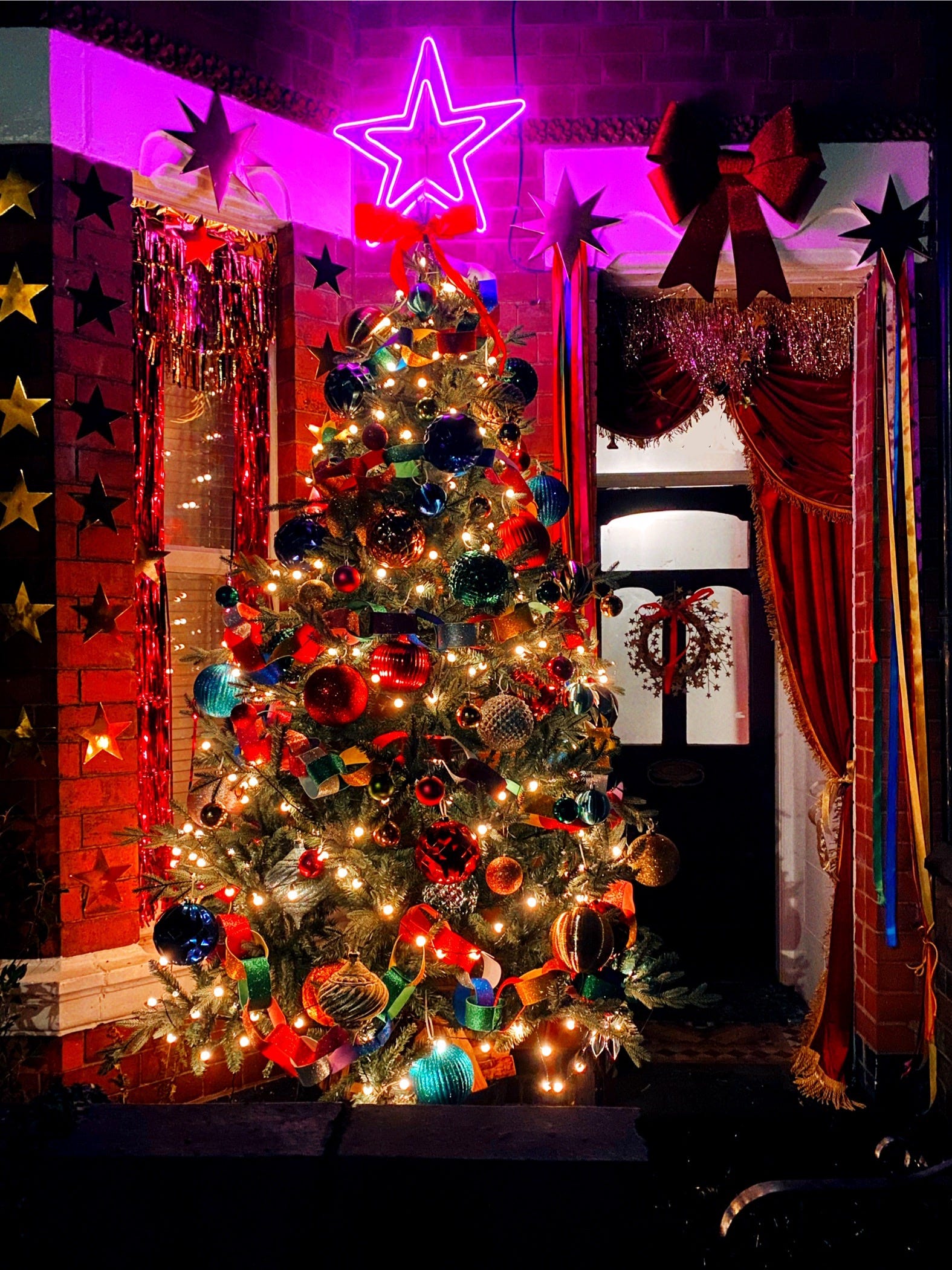 A towering tree! Giant baubles! Enormous paper chains! Gold stars! RIBBONS! A swagged theatre curtain!