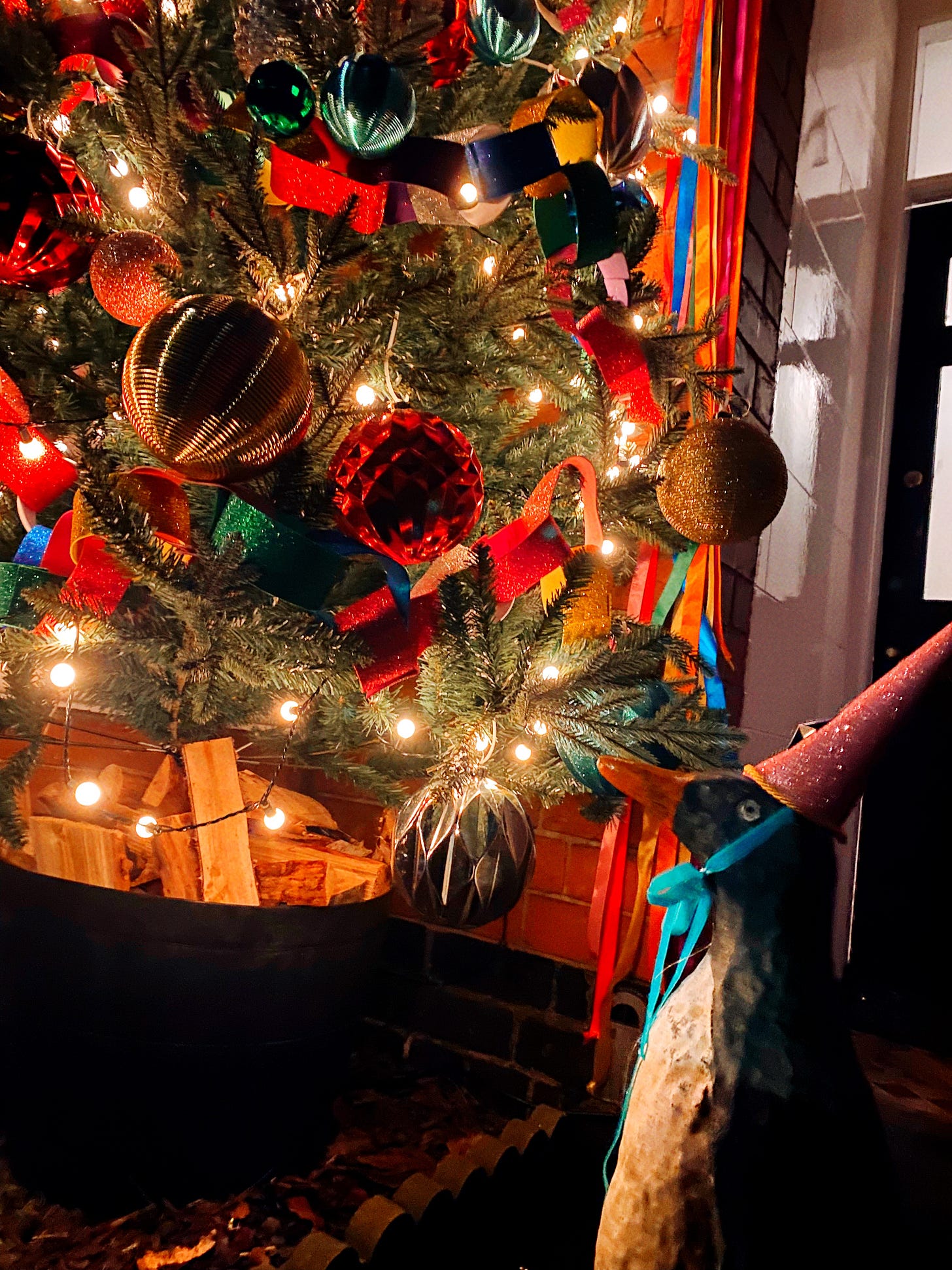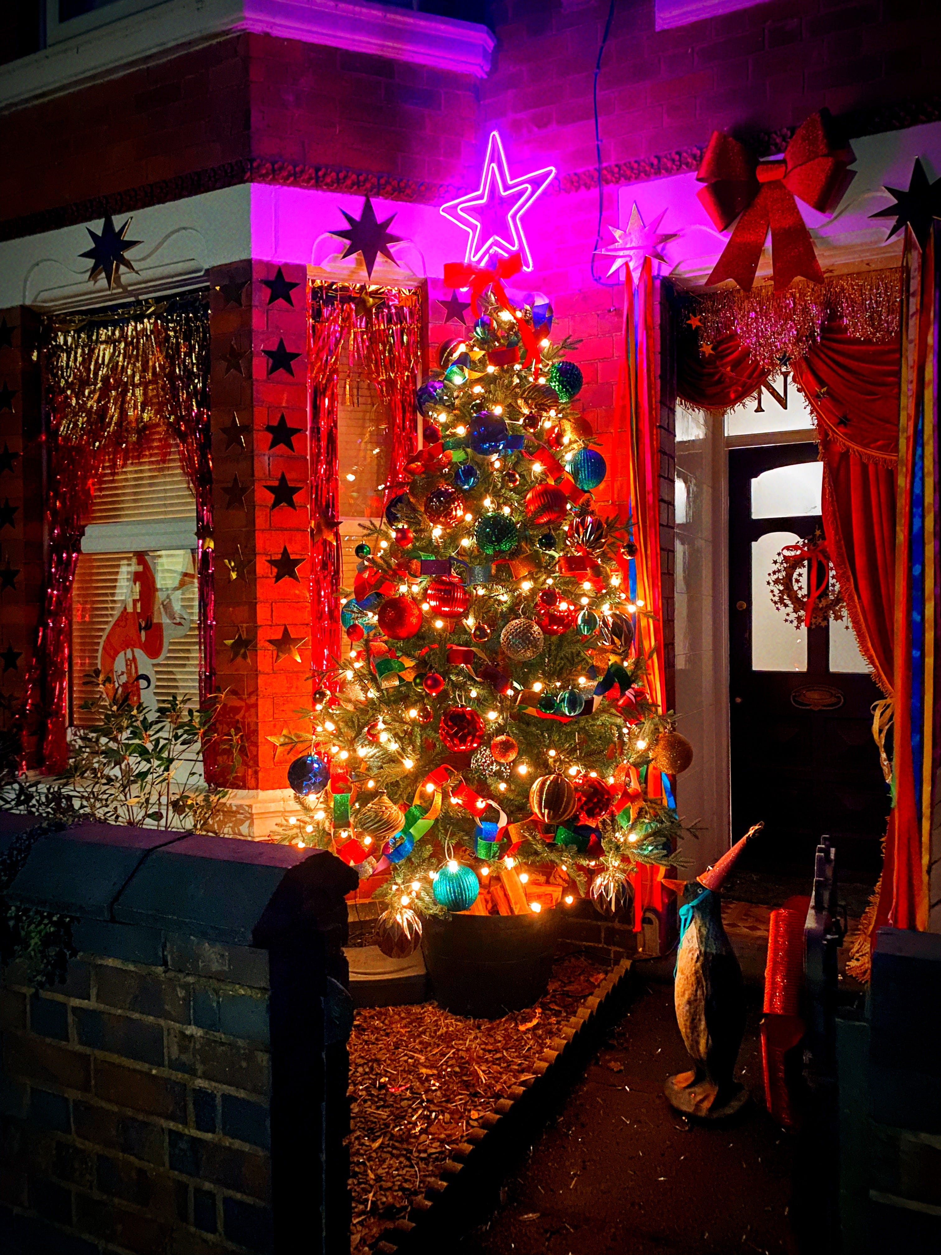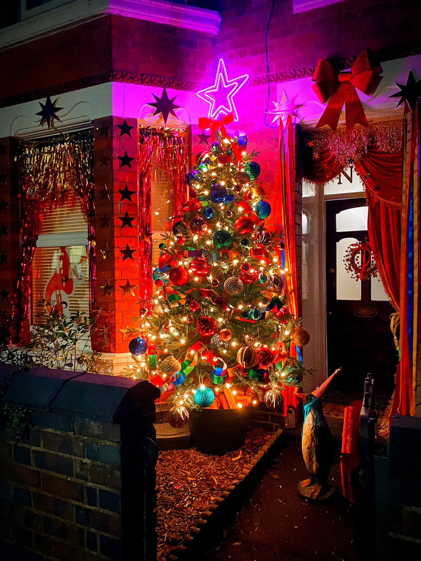 All of this (besides the baubles and tree) is made by me. I wanted the porch to look like a 1920s nightclub stage (but for penguins) or like something the Little Women would built to perform one of their plays. When it comes to Christmas decorations I’m FIRMLY in the more is more camp (and the camper the better) and I also need things to be a bit crafty and handmade.